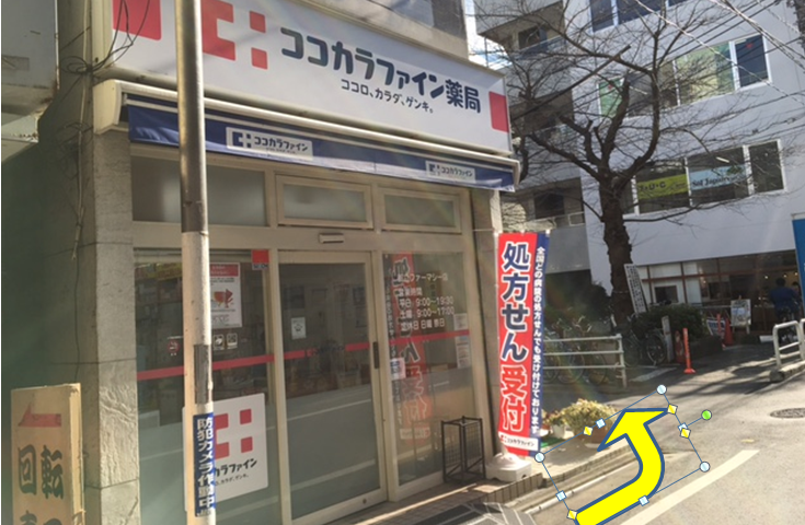 ココカラファインという薬局があり、左に入り駐輪場沿いに歩きます。