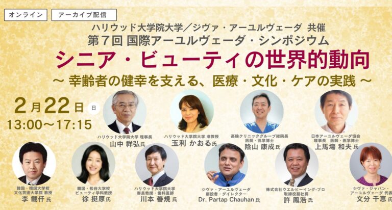 ハリウッド大学院大学/ジヴァ・アーユルヴェーダ共催 第7回 国際アーユルヴェーダ・シンポジウム「シニア・ビューティの世界的動向〜幸齢者の健幸を支える、医療・文化・ケアの実践 (2/22)」